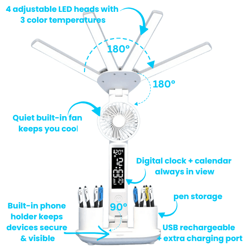 4 adjustable LED heads with 3 color modes (warm/neutral/cool white) reduce eye fatigue for reading, work, or late-night study sessions.
